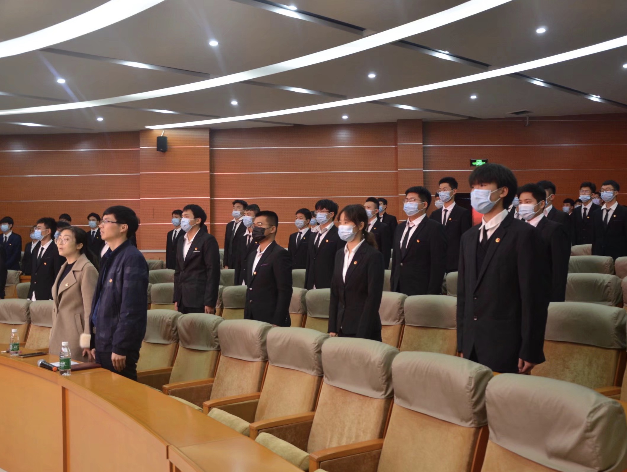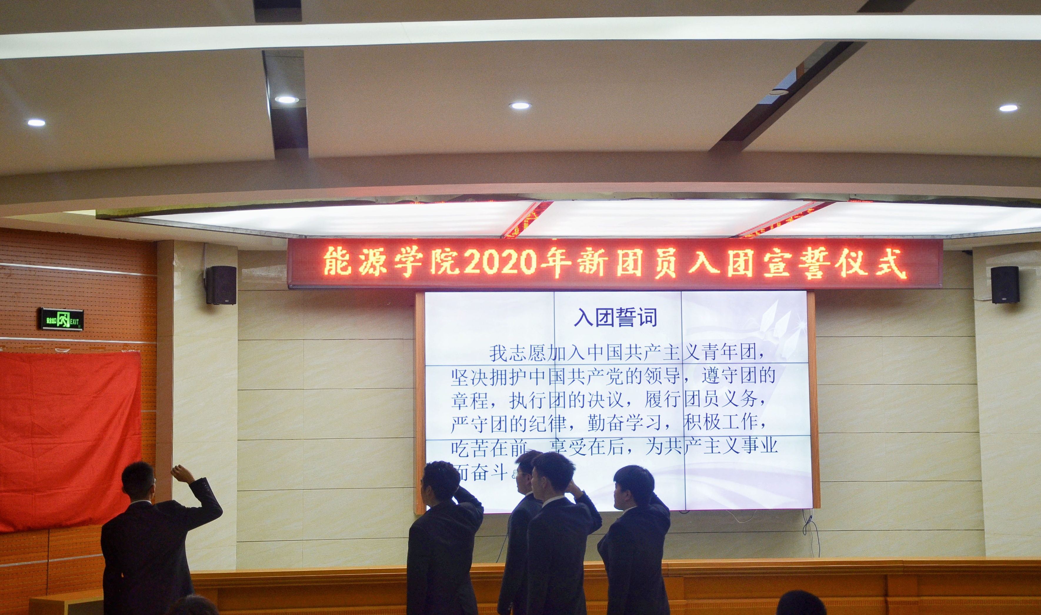 仪式在庄严的国歌声中拉开序幕,全体参会人员起立,奏唱国歌。仪式上,主持人朱晓琪宣读新团员名单,并由往届优秀团员代表们向新团员颁发团员证,佩戴团徽。然后,往届优秀团员代表丁御恒带领新团员进行宣誓,一句句铿锵有力的誓言,展现出了新团员们对共青团的向往与热爱。宣誓完毕,入团介绍人代表赵子晗宣读有关《团章》的内容,让团员们进一步明确自己的权利与义务。接着,新团员代表李桦佚和往届团员代表李晓婷进行了发言,他们表示会持续提高思想境界和知识水平,用实际行动为共青团事业增光添彩。随后,院团委书记王明中发表讲话,他希望新老团员们能够严格遵守团的纪律,坚守自己的信念,牢记自己的誓言,努力学习,为成为一个优秀的共青团员而不断努力。最后,仪式在青春激昂的《团歌》中拉下帷幕。