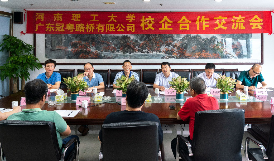 8月13日上午,郭保华一行赴广东冠粤路桥有限公司走访调研,与公司党委书记李宏泽、副总经理王穗青、技术总监李连生、人力资源部部长汪凯等进行了交流。交流会上郜进海、郭保华分别对冠粤路桥在学生就业、实习基地等方面的大力支持表示感谢,介绍了交通工程专业发展状况,征求了企业对人才培养工作的意见。而后,双方就校企合作、培养方案修订、学生就业等方面进行广泛、深入地交流,强调要发挥各自优势,实现资源共享,达到合作共赢的目的。