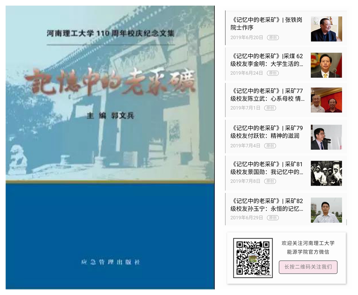自《记忆中的老采矿》征稿启事发出以来,得到了广大校友的积极响应和支持。校友们纷纷打开封存已久的历史记忆、挥笔写下了那些难忘的历史片段,抒发对母校、昔日恩师、同窗好友的真情实感,情真意切。经过编纂工作组分类和初审,性爱片 领导、采矿退休老干部、老教授等组成的审稿,作者本人修改完善,党委宣传部审核,最终收录了72篇(首)老采矿各届校友、老师发来的文章和诗词。与此同时,采矿62级校友、原浙江省政协主席李金明不仅深情撰文,还为本书提写了书名;采矿63级校友、河南省原常务副省长王明义撰文回忆了当年的老师和同学;采矿59级校友、原煤炭部总工程师尚海涛为本书题写了贺词;采矿62级校友、中国工程院院士张铁岗撰稿并作序;美国工程院院士、西弗吉尼亚大学原采矿系主任、现性爱片 特聘教授Syd S. Peng亲笔为本书书写贺词;现已98岁高龄的原采煤系书记张明撰写回忆文章并提供一批珍贵的老照片;原采矿工程系柴一言主任深情回忆了当年实验室建设的艰辛和成就;原焦作工性爱片 院长袁世鹰在此编纂过程中给予大力支持并提出了宝贵意见和建议;学校邹友峰书记、杨小林校长也非常关心本书的进展,多次进行指导。