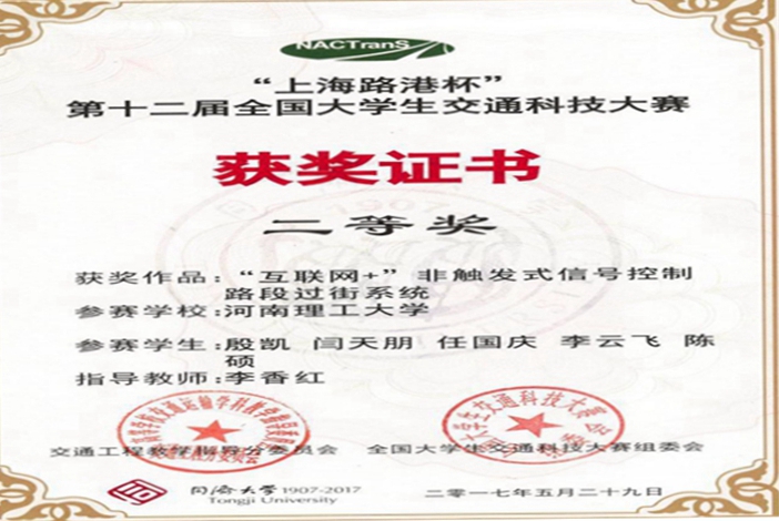 团委书记郭臻臻带领下,由交通工程系副主任李香红指导,殷凯、闫天朋、任国庆、李云飞、陈硕5位同学的作品《互联网+非触发式信号控制过街系统》入围决赛,经过现场激烈角逐最终荣获全国二等奖,取得我校继参赛以来的最好成绩。