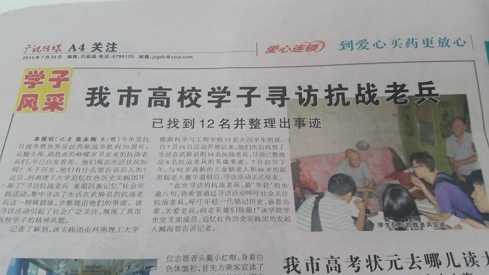 追忆红色历史实践团开展了“寻访抗战老兵 重温民族记忆”社会实践活动,集中寻访了生活在武陟县的抗战老兵这一特殊群体,并整理出他们的事迹。该寻访活动引起了社会广泛关注,展现了我市高校学子的精神风貌。