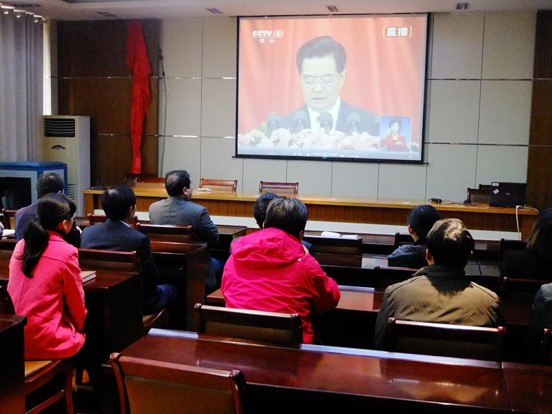 党委组织全体机关人员在院楼201会议室集体收看了十八大开幕式的盛况。