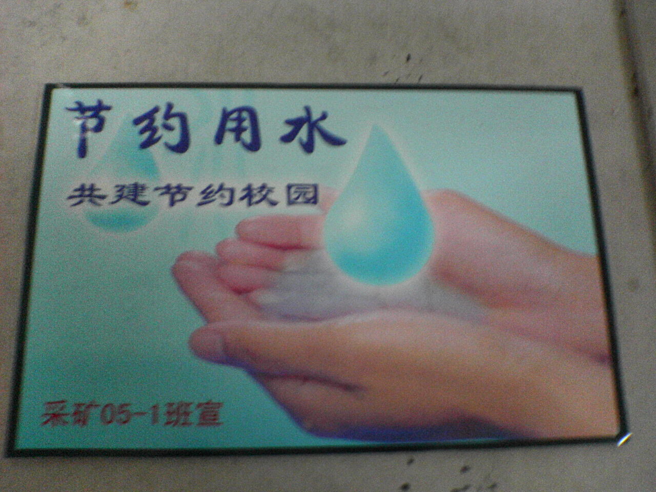 采矿05-1班团支部为进一步贯彻“大爱”理念,落实科学发展观,践行社会主义荣辱观,班级全体同学一致响应校团委和院团委“构建节约型校园”、“构建节约型社会”的精神号召,于2007年3月17日将4张“节约用水,共建节约校园”爱心提示牌挂在了学校两处开水供应点相应出,以此增强同学们的节水意识。