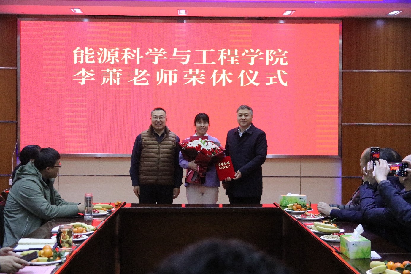 为李萧老师赠送鲜花并颁发“光荣退休”证书及纪念品。