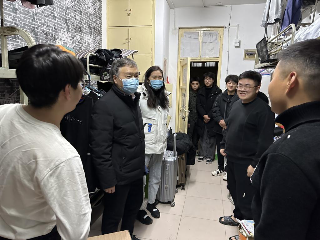 康全玉每到一间宿舍,都与同学们亲切交谈。他详细了解了同学们的身体健康状况和宿舍通风卫生情况,叮嘱大家“阳康”之后要适度锻炼,增强身体抵抗力,注意日常个人健康和公共卫生,加强宿舍开窗通风,养成良好的生活习惯。同时提醒同学们认真复习,在即将到来的考试中取得自己满意的成绩。郭文兵主要与高年级学生进行了交谈。他回顾了19级同学几经波折的考研过程,了解了同学们的考研情况,表示会和同学们一起期待最后的结果。他强调了毕业实习的重要性,希望高年级同学珍惜实习机会,深入了解生产现场的具体情况,将所学知识充分应用于实践中。