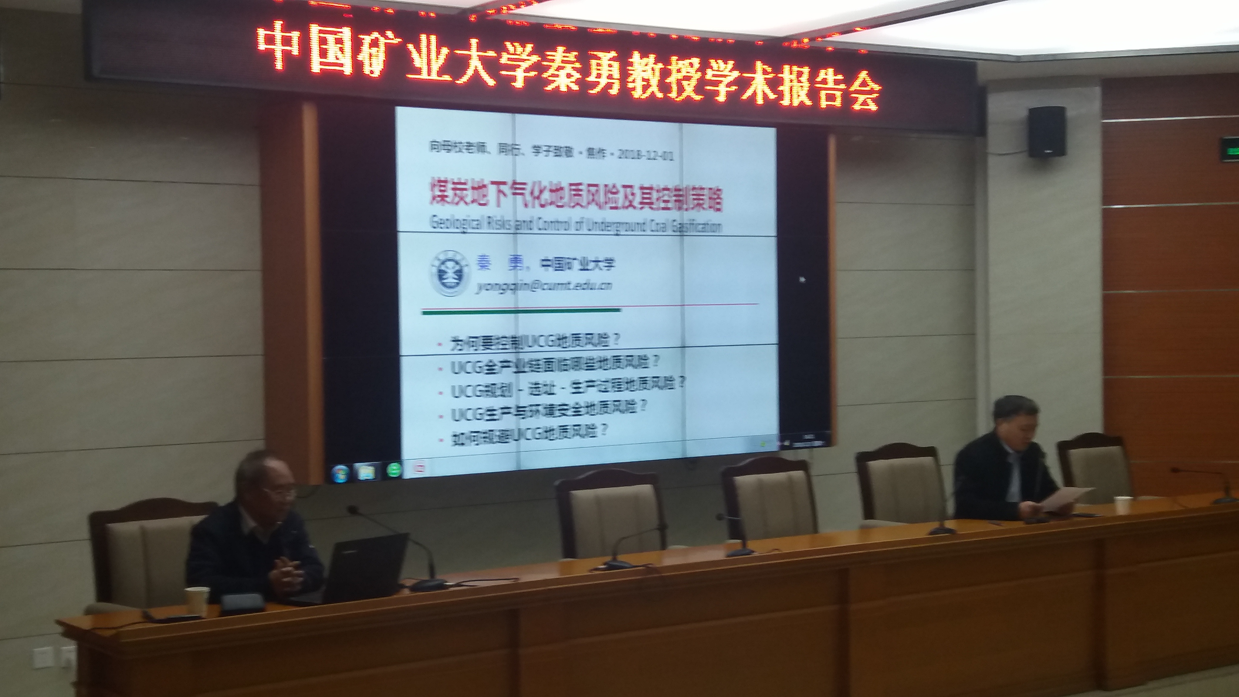 报告会上,秦勇教授从为何要控制UCG(煤炭地下气化)地质风险;UCG全产业链面临哪些地质风险;UCG规划-选址-生产过程地质风险;UCG生产与环境安全地质风险;如何规避UCG地质风险等方面介绍了煤炭地质气化所面临的地质风险及控制策略。并与现场师生对我国煤炭地下气化的实践及问题进行了讨论。